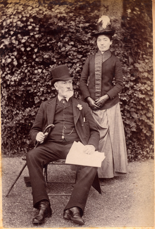 Description: A photograph of JR Branwell (sitting) and his eldest daughter, Laura Branwell, standing behind him, who both lived at Penlee House. They pose for a photograph within the grounds of Penlee. He wears a top hat, holding a walking stick and what appears to be a newspaper.