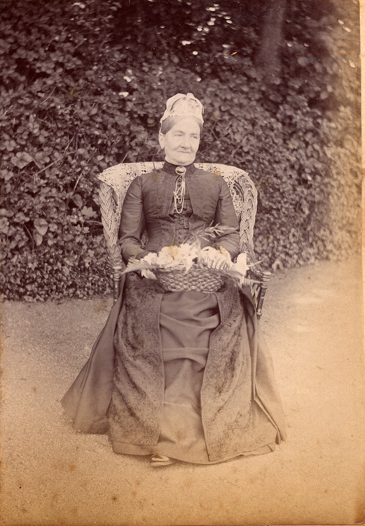 Description: Elizabeth Branwell, sitting within the grounds of Penlee. She was the wife of JR Branwell, who lived at Penlee House, a basket of flowers and ferns sits on her lap. The same wicker chair is used in PEZPH :1993.43.5, PEZPH :1993.43.8-9 and PEZPH :1993.43.14-15, PEZPH : 1993.43.20, PEZPH : 1993.43.30-31, PEZPH : 1993.43.38, PEZPH : 1993.43.55 and PEZPH : 1993.43.67.3.