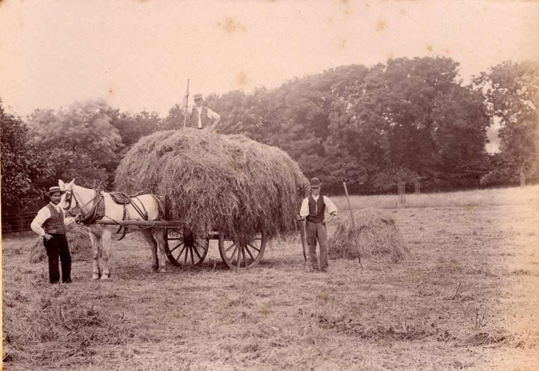 Description: A photograph of three men with a horse drawing a hay cart that is carrying hay. Two of the men hold a 2 prong hay fork. The man holding the horse and the man standing on the cart wear straw hats, whilst the third man wears a bowler hat. The location is likely to be the bottom of Penlee Park, identifiable by the iron fencing to the left.