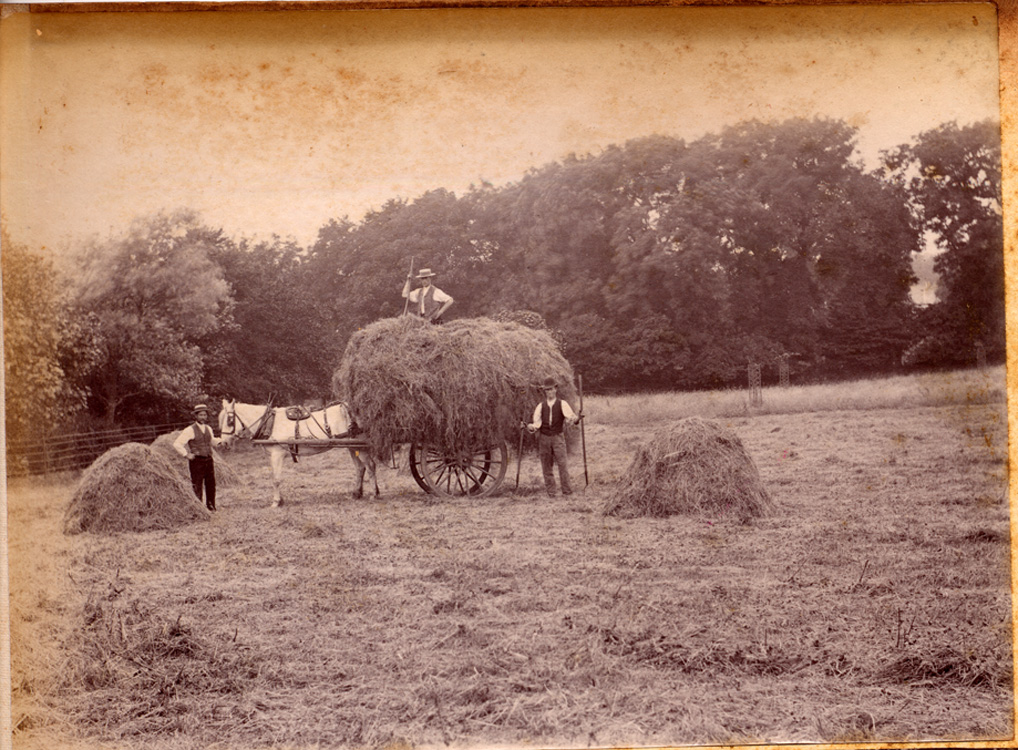 Description: This is a photograph of three men with a horse drawing a hay cart that is carrying hay. Two of the men hold a 2 prong hay forks. The man holding the horse and the man standing on the cart wear straw hats, whilst the third man wears a bowler hat. The location is likely to be the bottom of Penlee Park, identifiable by the iron fencing to the left. This is the same scene as in PEXPH : 1993.43.74, but taken from a distance.