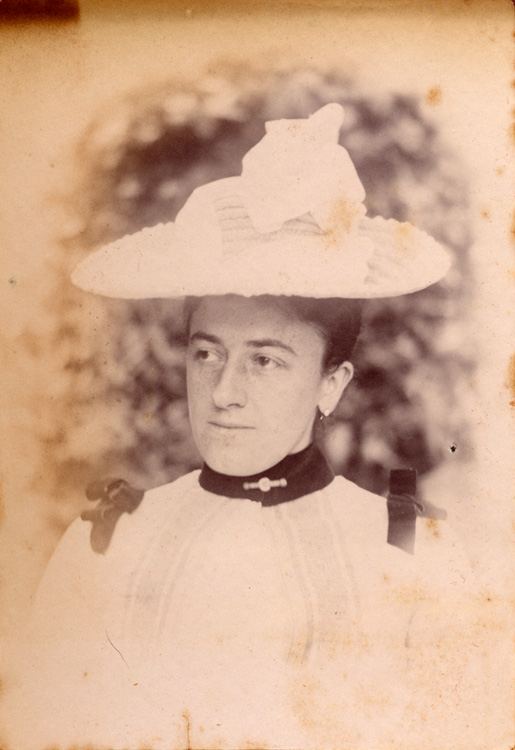 Description: A portrait of Marion Mudge, nee Branwell, third daughter of JR and Elizabeth Branwell, who lived at Penlee House. She stands within the grounds of Penlee House. She wears a wide-brimmed white hat and a light-coloured dress, with bows at the shoulder.