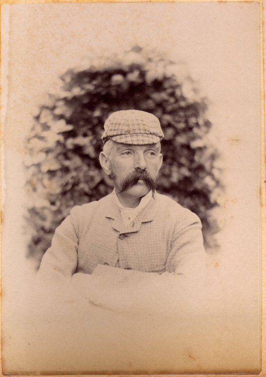 Description: A portrait photograph of an unknown man with a handlebar moustache, wearing a plaid cap and jacket.