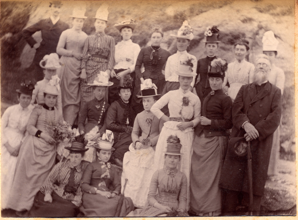 Description: A photograph of a group of women and two men on an excursion of some kind. Granite rocks lie behind them in an unknown location.