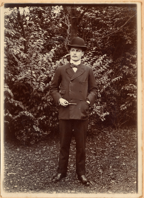 Description: An unknown man holding a pipe and wearing a bowler hat, standing within an area of greenery. The location is not identifiable. Elizabeth Trewhella suggests the man may be Alfred Branwell, youngest son of JR Branwell, who lived at Penlee House, but the likeliness is not so apparent.