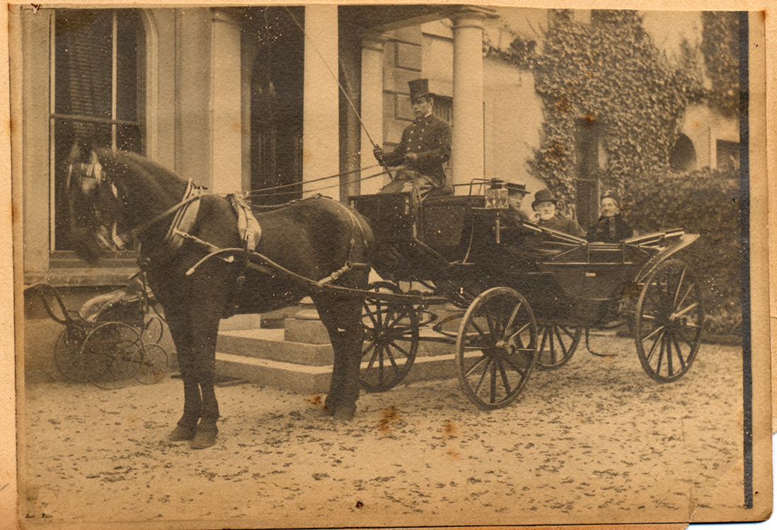 Description: A horse and carriage standing outside the front door of Penlee House. JR and Elizabeth Branwell sit in the carriage with their second daughter, Edith. The driver wears a top hat and holds a whip. A pram stands beside the wall to the left. Elizabeth Trewhella has dated this photograph to about 1895.