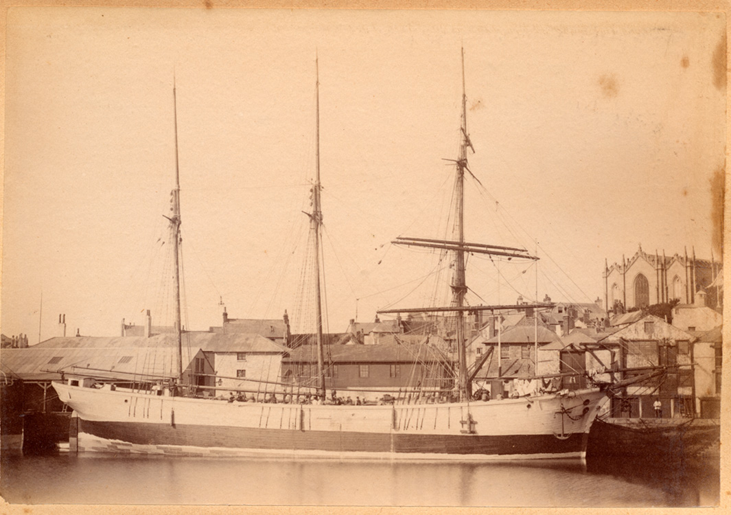 Description: Penzance Harbour Scene (late 1880s) – Lying alongside the western wharf, and riding high in the water, an unidentified barquentine appears to have discharged her cargo in Penzance Floating Dock. Thought to be one of the many vessels bringing grain to Penzance for the local flour and cattle-feed mills – Branwell’s, Bodilly’s, or Coulson’s. The buildings immediately behind the vessel are part of the Trinity House Depot, later obscured by the present buildings. Mathews’ Sail-Lofts stand on the right, with the east end of St. Mary’s church above.