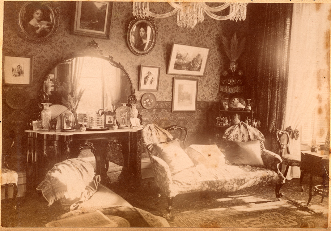 Description: The drawing room within the interior of Penlee House. The chandelier at the centre of the ceiling was still there in 1940. Other contents in the room include a chaise-lounge, two oval paintings of girls with a dove and dog and a decorative sideboard with mirror.