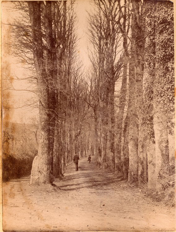 Description: Nancothan Avenue at Buryas Bridge with two lines of trees either side. A man and boy walk down the Avenue with their back to the camera.