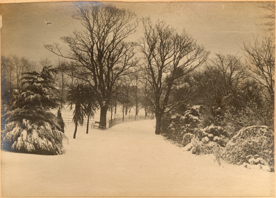 Description: Drive of Penlee House, looking down to the west from the house itself. The fields bordered by iron fencing lie to the left. Pictured during the snow blizzards of 1890 and 1891.