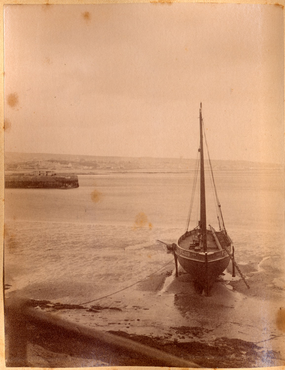 Description: Newlyn lugger PZ. 221 on the shore at Newlyn harbour. To the left can be seen the North Pier, the first arm of which was built in 1886.