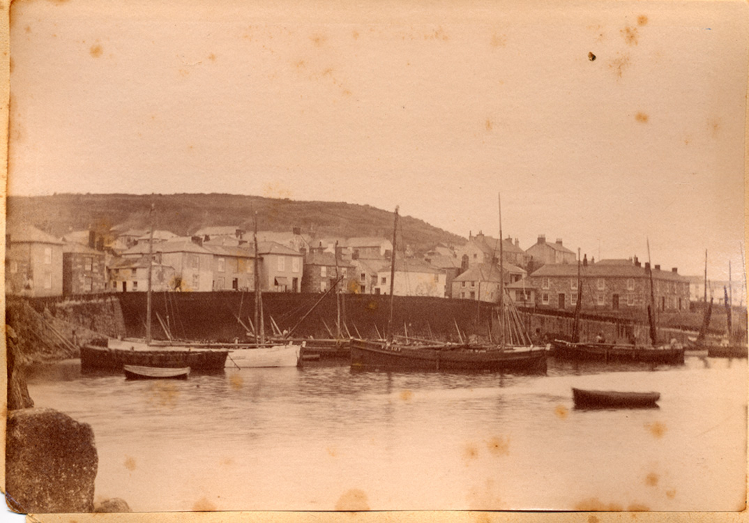 Description: Boats in Mousehole old harbour, taken from South Cliff. To the right is Quay Street and to the left, North Cliff. One of the boats can be identified as 'PZ. 101 Reaper'. To the left a white washed mackerel boat is laid up; to the right, mackerel boats with their sails temporarily stowed. When boats were laid up, they were sometimes white washed to prevent damage from the sun. If luggers were going to sea the same day, their sails were often given a temporary stow.
