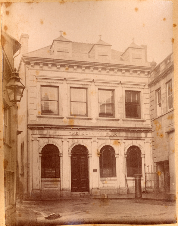 Description: A photograph of the Cornish Bank Ltd. of Truro at Queen's Square, Penzance. Carved in stone lettering on the front of the building is 'The Cornish Bank'. Situated where there is now a Co-operative. William George Dix was their manager in 7th March 1883 and Alfred W. Parks was the manager in 1885. It was taken over in 1902 by Capital & Counties Bank which became part of Lloyds.