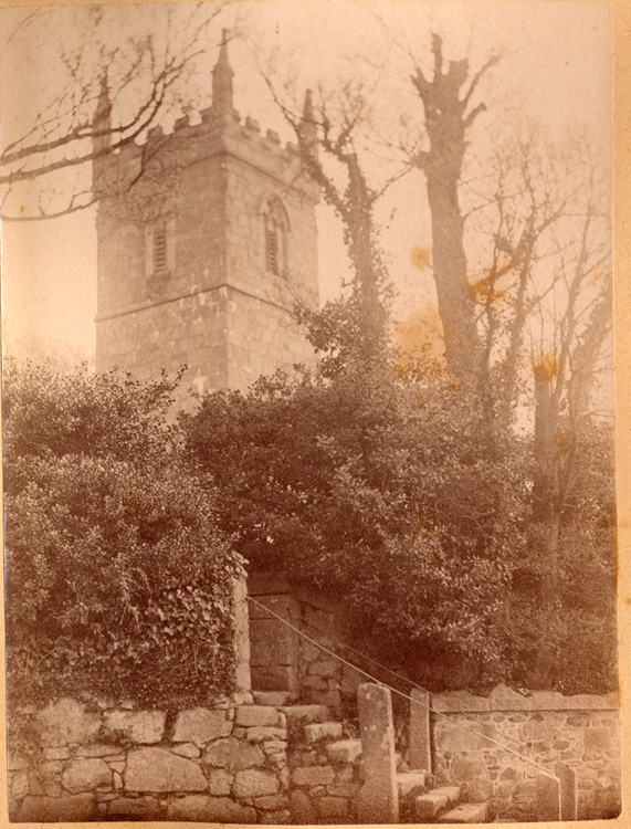 Description: The side entrance to Gulval Church. Granite steps with an iron railing lead upwards. The Church tower can be seen in the background.