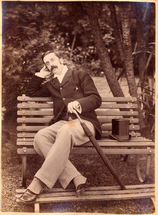 Description: A photograph of an unknown man sitting on a wooden bench, most likely within the grounds of Penlee House, because the bench has appeared in other photographs in this location. His top hat sits on the bench and he holds a closed black umbrella, wearing checkered trousers, a dark jacket and glasses.