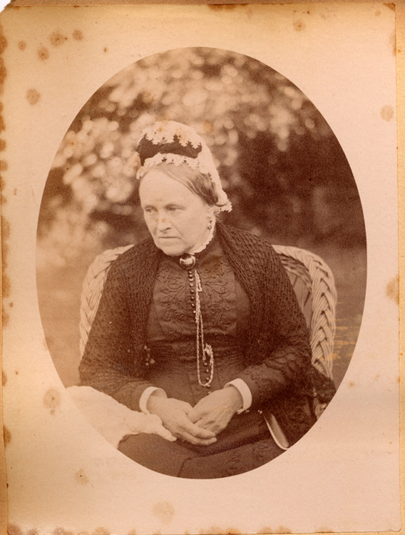 Description: An oval photograph of an unknown lady sitting in a wicker chair within the grounds of Penlee House.