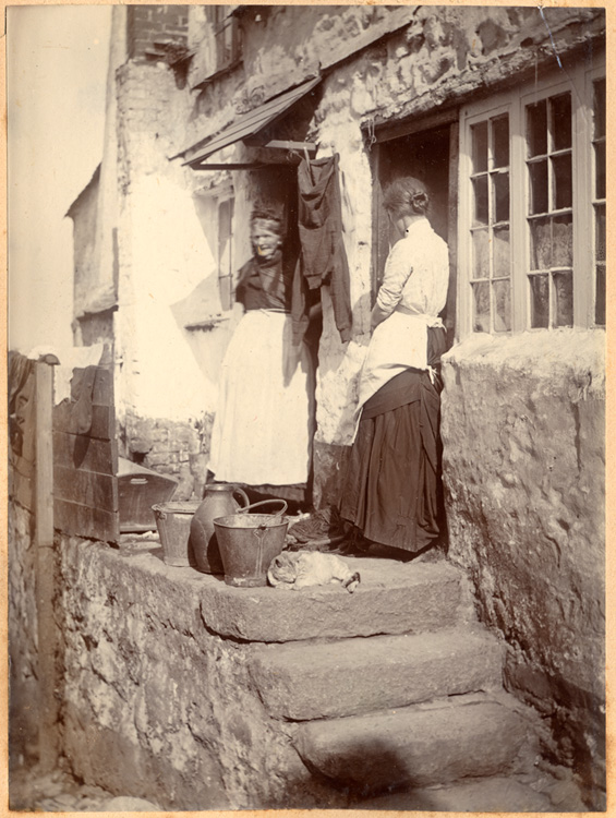 Description: An older and a younger woman talking on the steps of the entrance of two terraced cottages in Newlyn. In front of them are two pails, a bussa and a sleeping cat. Clothes hang out to dry between the two doors and on the wooden fence to the left. Both wear aprons tied in two places at the back.