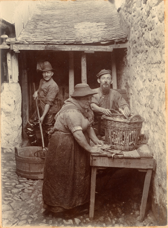 Description: Two jousters and a fish-wife gutting the catch in the courtyard of a cottage in Newlyn. The unknown lady and man standing to the right picking pilchards (fairmaids) out of a wicker basket, which is placed on a table. The man to the left uses an instrument to press the fish into a wooden barrel, wearing waterproof trousers and a soft-brimmed hat. The woman wears an apron, shawl and similar soft-brimmed hat. The pilchards were salted down and pressed into barrels, much of the catch being sent to Italy.