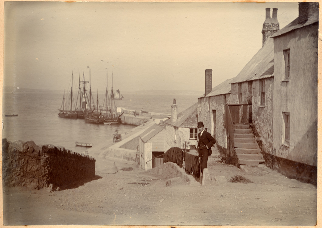 Description: A photograph of a man wearing a bowler hat and suit outside the row of cottages down the Slip at Newlyn. A number of fishing nets are drying on the iron railings that lead down the upper terrace to the right. In the background can be seen a number of larger boats and the lighthouse on the south pier of Newlyn harbour.