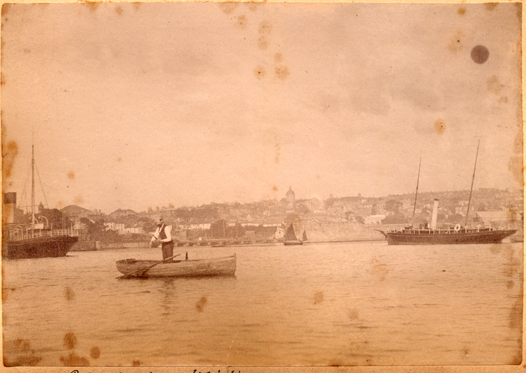 Description: Penzance : Harbour Scene (c.1890). A man standing in a rowing boat off Penzance harbour (believed to be John Branwell, eldest son of J. R. & Elizabeth Branwell), appears to be winding a fishing line onto a wooden frame. In shot are two steam-vessels and a small lug-rigged boat. Only the stern of the steamer to the left is visible, but she appears to be the s.s. Lyonnesse, built at Hayle in 1889, for the West Cornwall Steamship Co., Ltd. – probably moored alongside the extension (lighthouse) pier. To the right is an unidentified, black-hulled, steam yacht . In the background can be seen the viaduct of the Wharf Road, adjoining the Ross Bridge, and the outer face of the Albert pier. The dome of the Market House, breaks the skyline above the town.