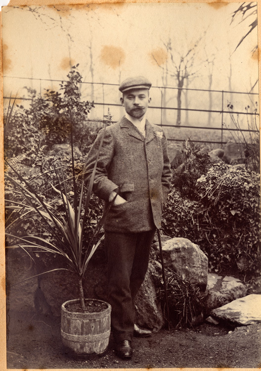 Description: A full length photograph of an unknown man standing within the ground of Penlee House. In the background can be seen the fenced fields that were situated at the bottom of the garden. He stands next to a small potted palm tree, holding a stick and wearing a flat cap.