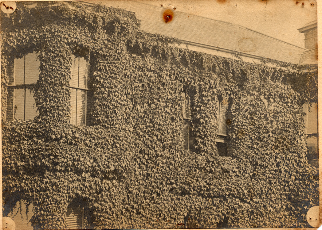 Description: A close-up photograph of Penlee House itself, showing the first floor windows of the bedrooms. The house is covered in Virginia Creeper.