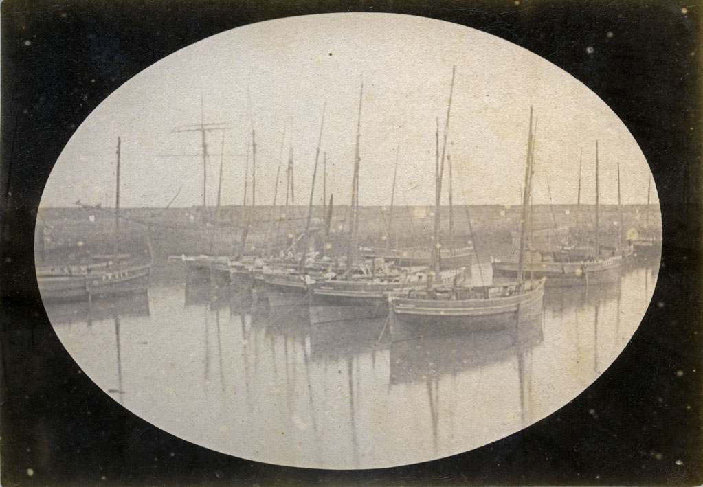 Description: A photograph of Newlyn Harbour with mackerel boats on moorings and three masted schooners alongside the North Pier. The North Pier was completed in 1894. In bad weather the harbour was subject to strong surges so the luggers were on moorings. On 7 April 1899, thirteen luggers were washed out of the harbour in a NW storm. The problem was solved by extending the South Pier, completed in 1915. From then boats could moor up alongside the North Pier.