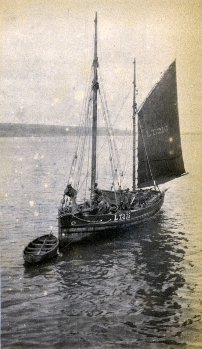 Description: This is a picture of the Lowestoft sail drifter, The Band of Hope, LT. 175 in Penzance Harbour, built at Lowestoft in 1887 by H. Reynolds. The Band of Hope was a teetotal organisation.