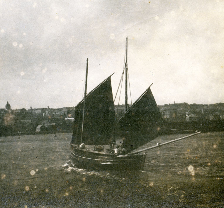 Item: A Mackerel boat running into Penzance Harbour under reduced sail.