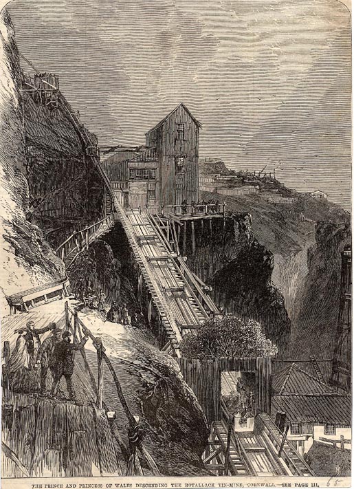 Description: Engraving of the Prince Albert Edward and Princess Alexandra of Wales descending Botallack Mine in July 1865. From a page of the Illustrated London News.
