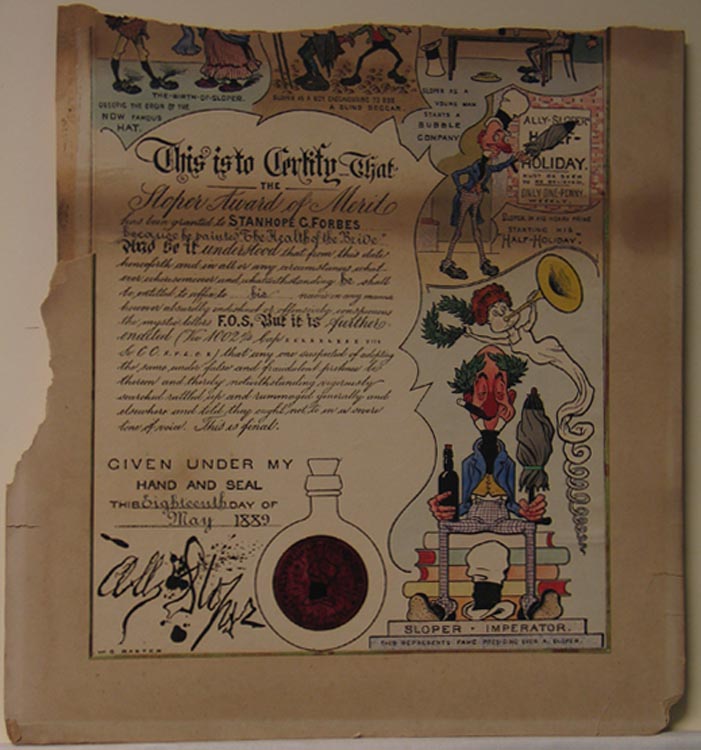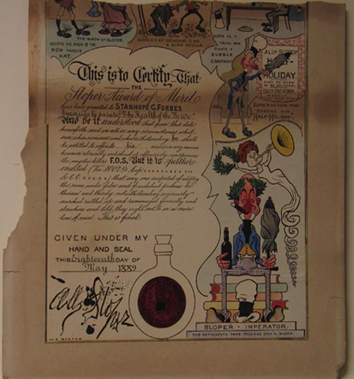 Description: Spoof certificate for Sloper Award of Merit granted to Stanhope Forbes, 18.5.1889.