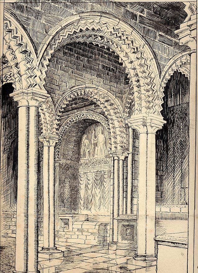 Description: Drawing of a cathedral interior by Alec Forbes, son of Stanhope and Elizabeth.