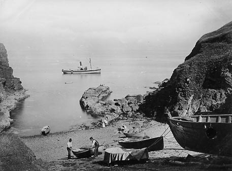 Description: View of Church Cove on the Lizard peninsula. The small steamer at sea is the 'SS New Resolute' which has landed tourists by rowing boat and is awaiting their return. Many Falmouth tugs served as excursion steamers and ran trips to the Helford and Lizard. At Church Cove the visitors were landed at Battleship Rock, in the centre of the photograph, at low tide and had to scramble to shore over slippery rocks.