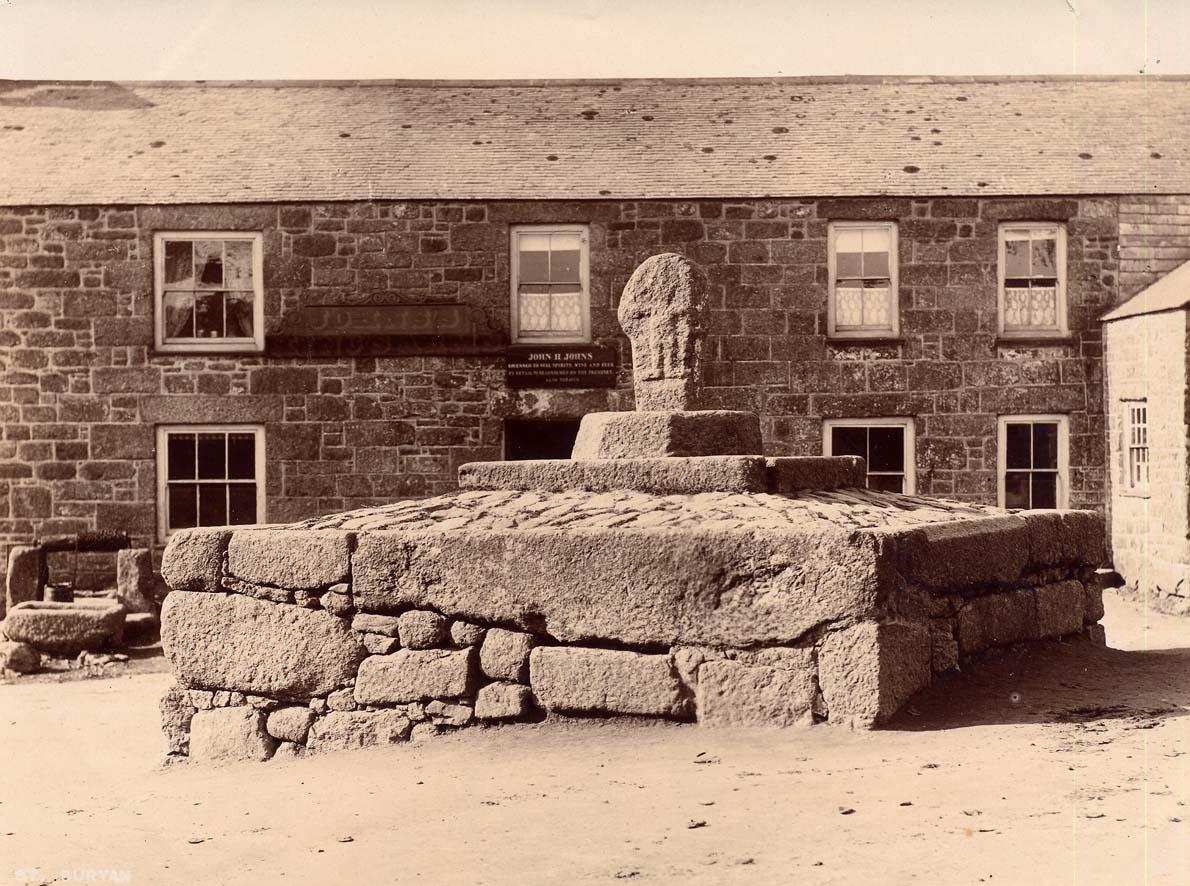 Description: St Buryan Cross - height 2.26 m (7' 5"); height of cross 0.81 m (2' 8"); width of head 0.66 m (2' 2"); width of shaft 0.20 m 1'; thickness at bottom 0.25m (10"); thickness at top 0.20 m ( 8"). The cross, which faces East and West, consists of a fine, four-holed head in a good state of preservation. The shaft was probably originally much larger. The base is almost square and is built of roughly wrought granite. In 2013 the cross stands in the churchyard but this is a picture of it outside there on a raised stone platform. The face depicts a figure of Christ with outstretched arms to form a horizontal cross. The feet are turned out. The Reverend Croft suggests that the cross was adopted as the Deanery Market Cross when the parish was granted a charter for a market in 1302. In the background is the village inn with a stone trough to the left.