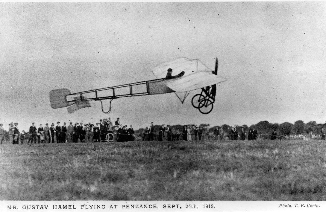 Description: Gustave Hamel flying a Bleriot biplane near Penzance, probably Major Bolitho's Trengwainton Estate Fields. The photograph was taken on 4 September 1913. Hamel was a pioneer of early British aviation, and sadly died the following year. There were adverts in the Cornishman offering rides to the public.