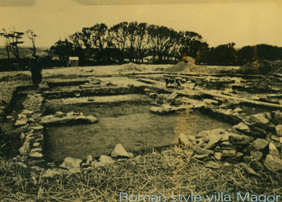 Description: This is a 1931 postcard of the remains of the Roman villa at Magor near the North Cliffs between Camborne and Redruth. The remains were uncovered in 1931, but to date there is no explanation as to why it was built there or by whom.