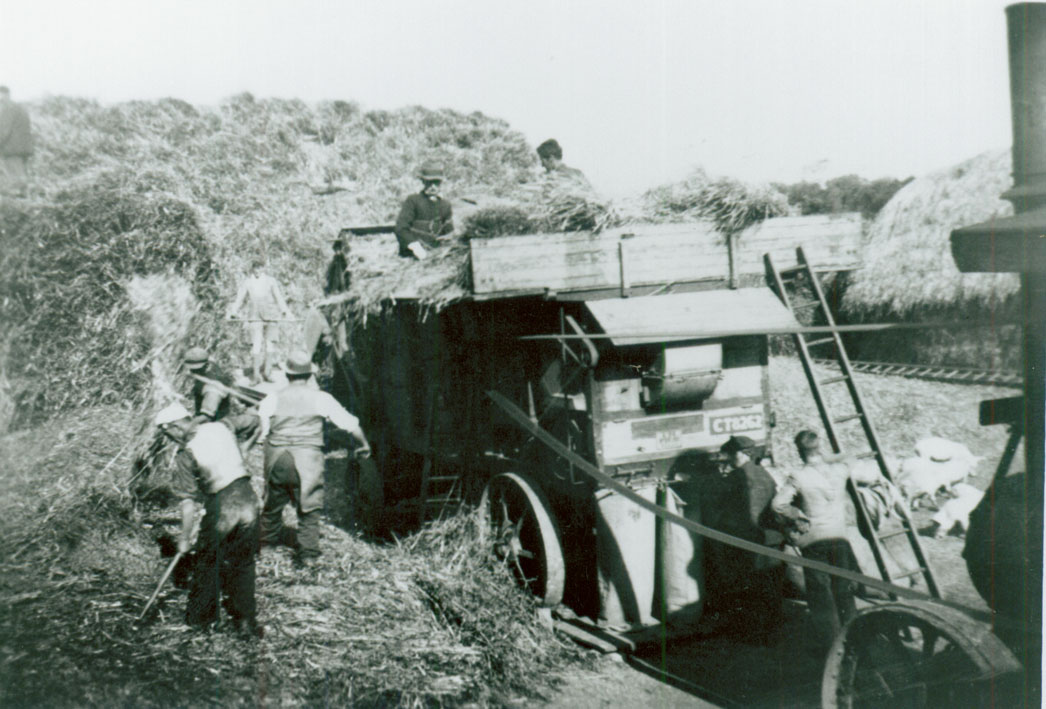 Description: A team is harvesting the crop using a threshing machine operated by a traction engine. A team of about 16 would be needed and this would consist of labour from neighbouring farms and a travelling team of harvesters. Thus there would usually be one specialist for each task, ie rick building, rick thatching, pitching, etc. Whichever farm they worked on provided refreshment throughout the day.