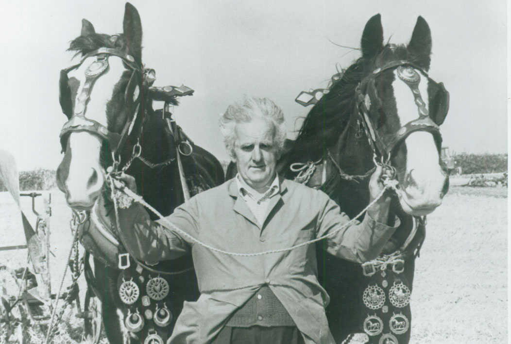 Description: Cyril Eddy worked with horses all his life and 'retirement' gave him a chance to concentrate on preparing his heavy horses for showing. Here, beautifully groomed they show off their brasses and medals.