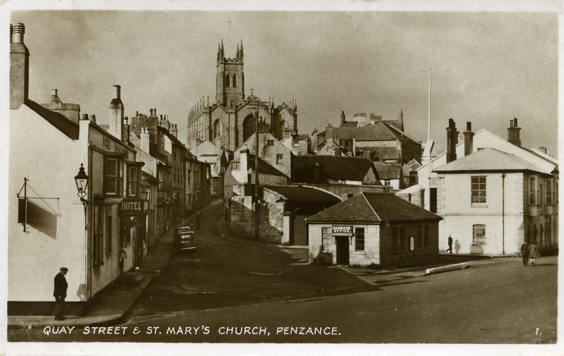Description: One of the oldest streets in Penzance, Quay Street links the harbour with Chapel Street which was the main route for traffic using the harbour. The hotel on the left bears the shadow of a sail; there is a gas lamp post on its corner. St Mary's Church dominates the scene with the old harbour office below. The houses on the right of Quay Street were demolished in the 1950s to be replaced by offices and flats. The building on the right became the site of the Trinity House Depot but in 2012 is empty.