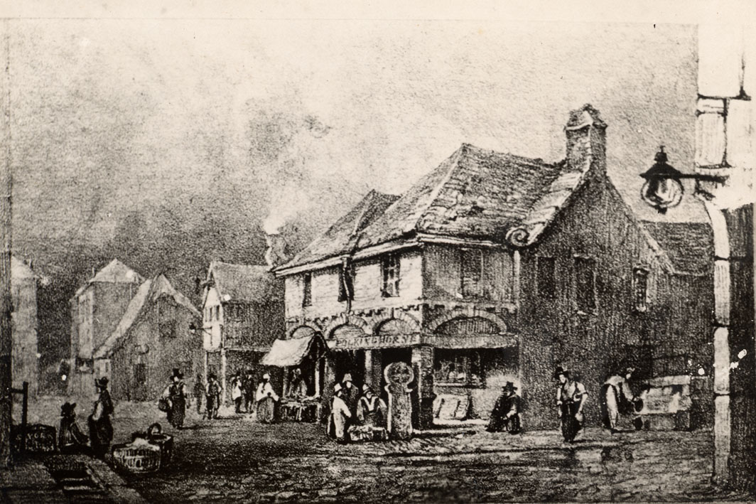 Description: Photograph of a coloured engraving by J S Prout of Greenmarket, Penzance and was printed and published by J P Vibert in 1831 which is PEZPH 1999.217. Left to right are two figures with baskets by a raised, possible drained, area; an inn with a raised storey; a shopping arcade (Polkinghorne) with a stall outside; the market cross from which Penzance Borough extended half a mile was moved from here in September 1829; scrolled roof edging; woman fetching water from the chute; oil or gas lamp.