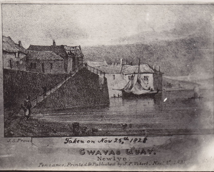 Description: Engraving by J S Prout of Gwavas Quay, Newlyn, printed and published by J P Vibert of Penzance, November 1st 1837