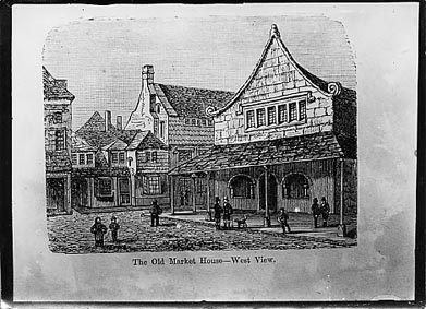 Description: Engraving of the West View of the Old Market House, as seen from the corner of Causewayhead. There are no clouds, the cobbles are flat, the brickwork is immaculate, the bystanders well behaved - a rather idealised view of the town.