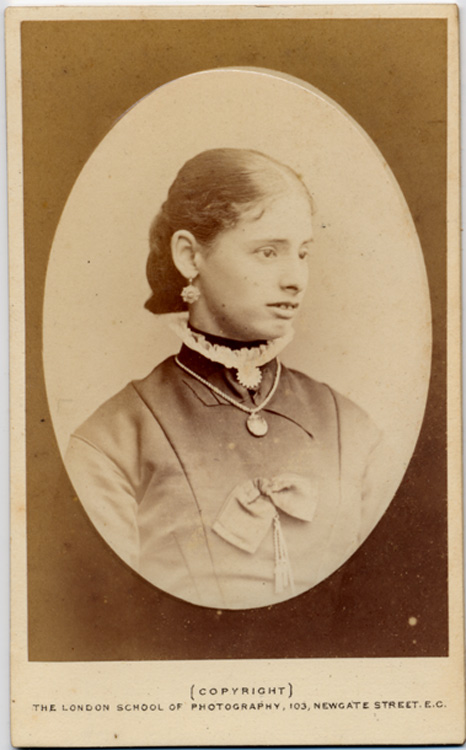 Description: A carte de visite (oval photograph) of Lena Harry. Below left is printed 'Copyright The London School of Photography, 103 Newgate Street E.C'. On the reverse is an advertisement for W.S Bradshaw, who has worked for 20 years as a photographer for the London School of Photography. Also stated 'This Negative May Be Registered For One Shilling'. On their emblem are the words 'Domine Dirige Nos'.