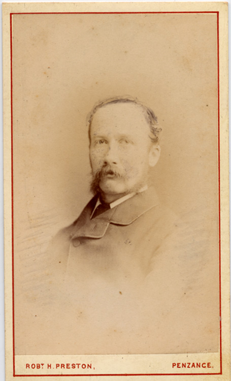 Description: A carte de visite (oval photograph) of John Branwell, who lived at Penlee House. He was the eldest son of JR and Elizabeth Branwell, who lived at Penlee House. Below left is printed 'Robt. H. Preston' and to the bottom right 'Penzance'. On the reverse the Preston emblem is printed - 'ROBT. H. PRESTON. Photographer TO THE PRINCE AND PRINCESS OF WALES. PENZANCE'