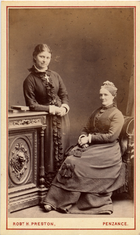 Description: A carte de visite of Phil Branwell (sitting) and Fanny Mudge. Below left is printed 'Robt. H. Preston' and to the bottom right 'Penzance'. On the reverse the Preston emblem is printed - 'ROBT. H. PRESTON. Photographer TO THE PRINCE AND PRINCESS OF WALES. PENZANCE'