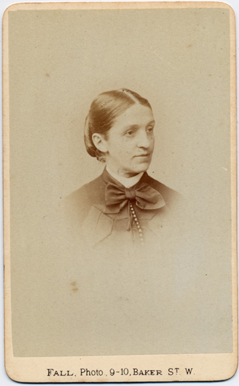 Description: A carte de visite of Julia Branwell, aunt of Vera, Edward and Sybil Branwell, grandchildren of JR Branwell, who lived at Penlee House. The caption says 'Aunt' , although cannot find her in the Branwell family tree. Below is printed 'FALL. Photo 9-10, Baker Street. W.' On the reverse is an advertisement of the photographers T.Fall. 'For many years chief photographer to Elliot and Fry'
