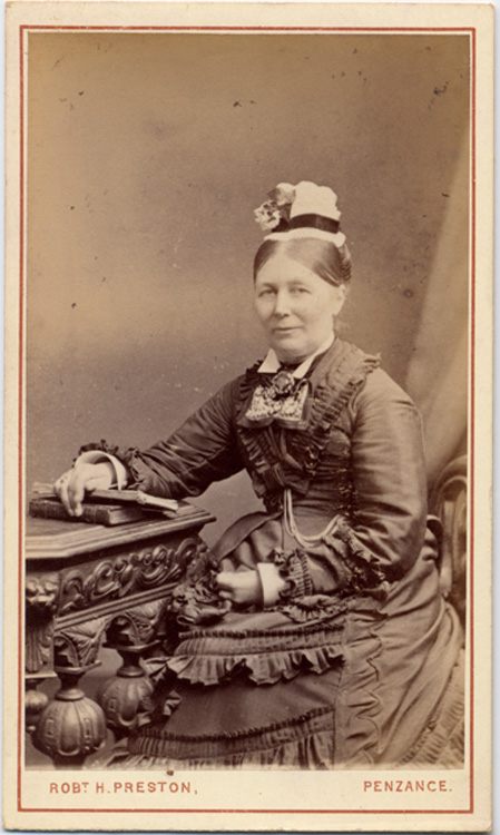 Description: A carte de visite of 'Aunt Lizzie Dennis', perhaps an aunt of Vera, Edward and Sybil, grandchildren of JR Branwell, who lived at Penlee House. Below left is printed 'Robt. H. Preston' and to the bottom right 'Penzance'. On the reverse the Preston emblem is printed - 'ROBT. H. PRESTON. Photographer TO THE PRINCE AND PRINCESS OF WALES. PENZANCE'