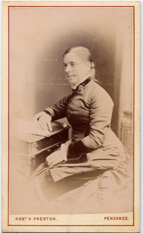 Description: A carte de visite of an unknown woman, perhaps a friend of the Branwell family, who lived at Penlee House. Below left is printed 'Robt. H. Preston' and to the bottom right 'Penzance'. On the reverse the Preston emblem is printed - 'ROBT. H. PRESTON. Photographer TO THE PRINCE AND PRINCESS OF WALES. PENZANCE'