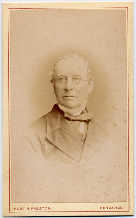 Description: A carte de visite of 'Uncle James Dennis', likely to be a relative of JR Branwell and his family, who lived at Penlee House. He is wearing small rimmed glasses and a bow tie. Below left is printed 'Robt. H. Preston' and to the bottom right 'Penzance'. On the reverse the Preston emblem is printed - 'ROBT. H. PRESTON. Photographer TO THE PRINCE AND PRINCESS OF WALES. PENZANCE'.
