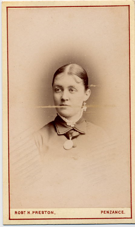 Description: A carte de visite of 'Florence Quick', related to 'Cousin Charles Quick' who was perhaps a cousin of JR Branwell and his family, who lived at Penlee House. On the reverse the Preston elblem is printed - 'ROBT. H. PRESTON. Photographer TO THE PRINCE AND PRINCESS OF WALES. PENZANCE'.