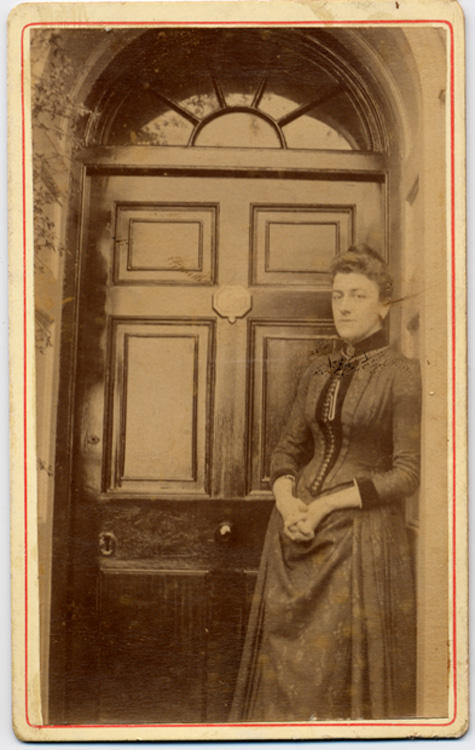 Description: A photograph of Marion Mudge, nee Branwell, wife of John Mudge, third and youngest daughter of JR Branwell, who lived at Penlee House. She stands in front of a black front door. Nothing is printed on the reverse.
